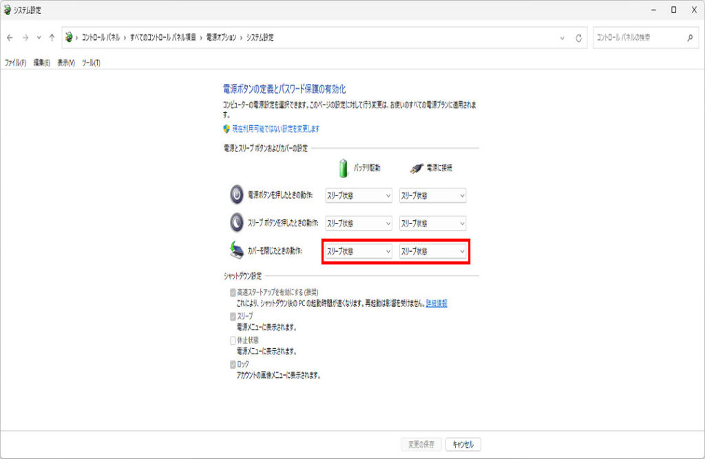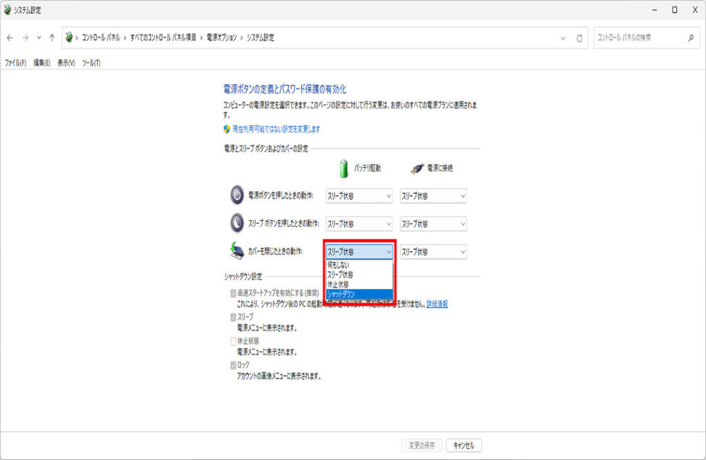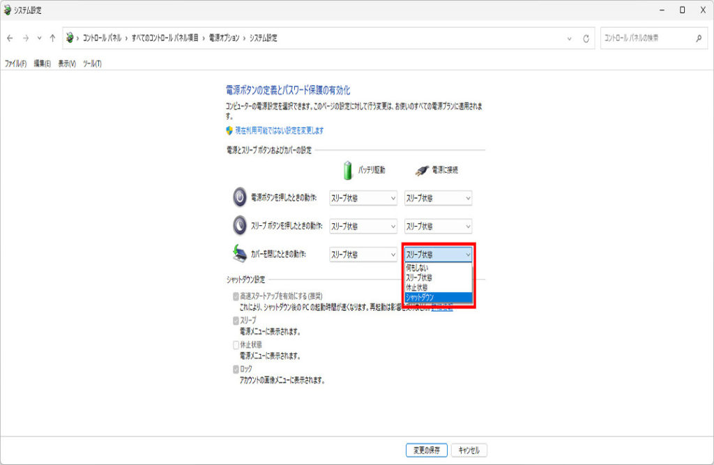 「カバーを閉じたときの動作」を再確認します「変更の保存」をクリックします。