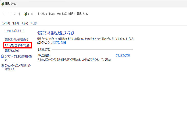 左メニューの「カバーを閉じたときの動作の選択」をクリックします。