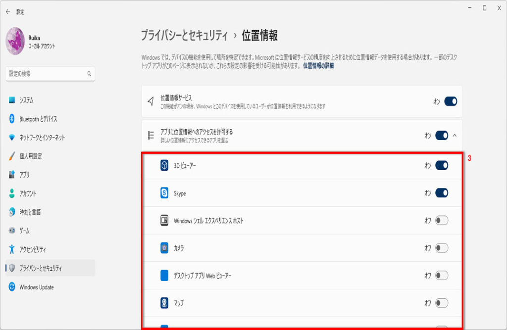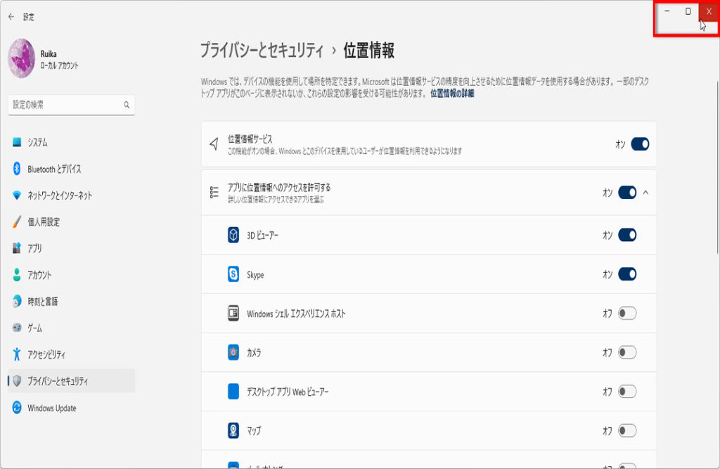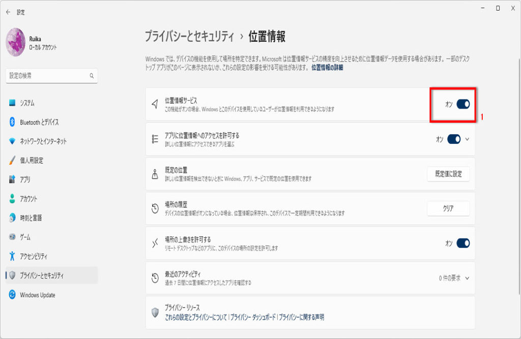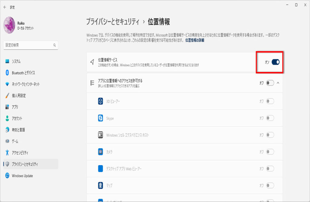 (パソコンの位置を無効にする場合は、オフにしておきましょう)