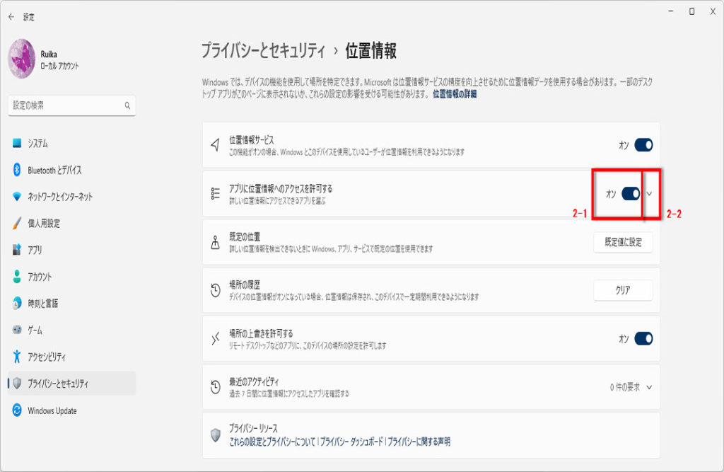 2-1 「アプリに位置情報へのアクセスを許可する」を「オン」に変更します、