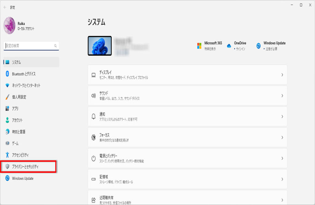 「設定」画面が表示されます「プライバシーとセキュリティ」をクリックします。