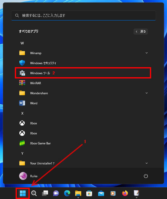 2 すべてのアプリの「Windowsツール」をクリックします。