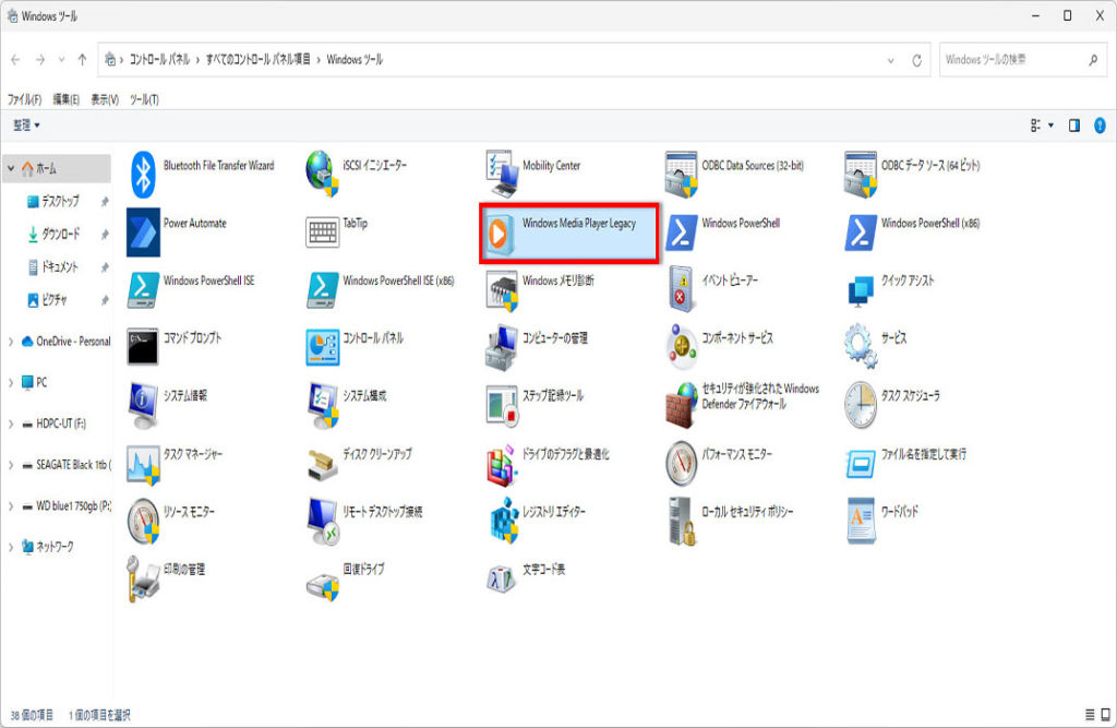 コントロールパネルが表示されます「Windows Media Player Legacy」を