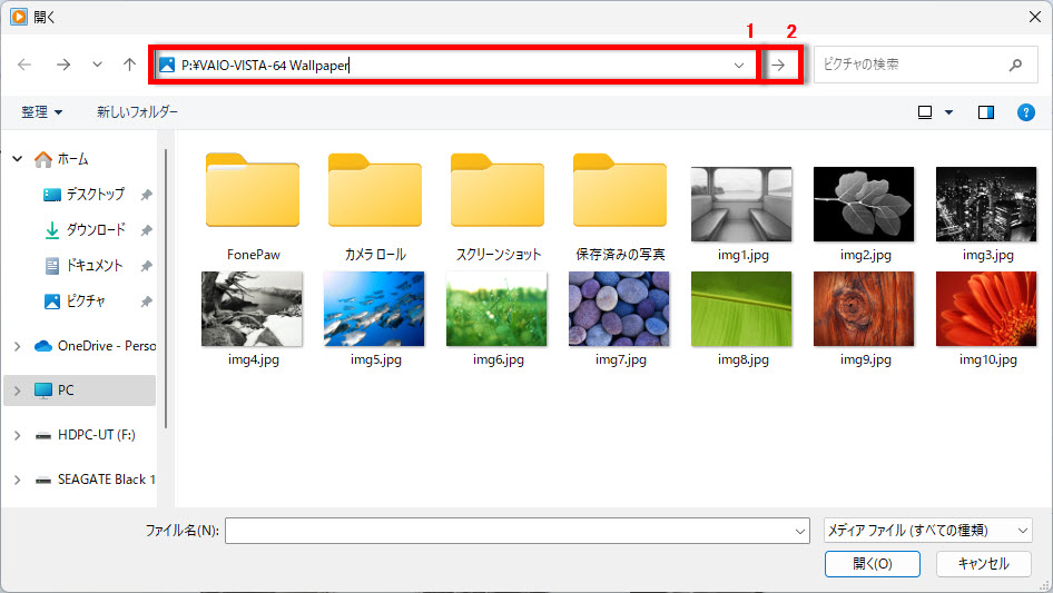 例としてリンク先は P:\VAIO-VISTA-64 Wallpaper になります。