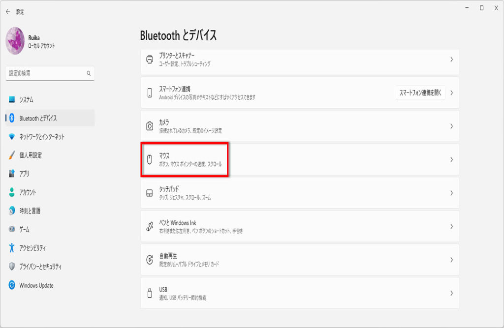 「Bluetoothとデバイス」画面が表示されます、画面を下にスクロールして