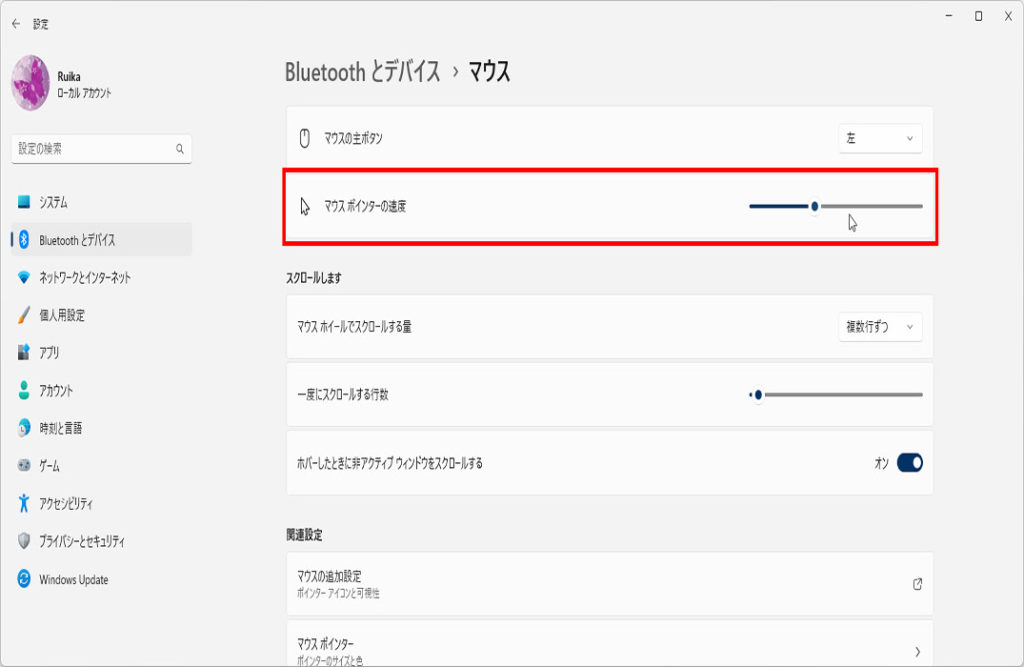 「マウス」画面が表示されます、「マウスポインターの速度」のスライダーを左右に