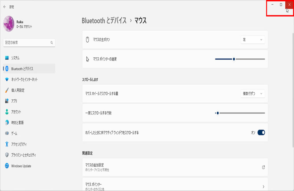 「Bluetoothとデバイス」画面を下にスクロールして「マウス」に移動します、