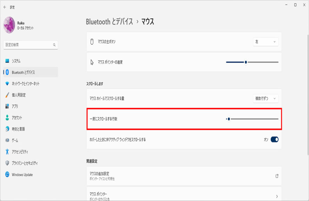 「一度にスクロールする行数」でスライダーを左右にドラッグ、お気に入りの行数を、
