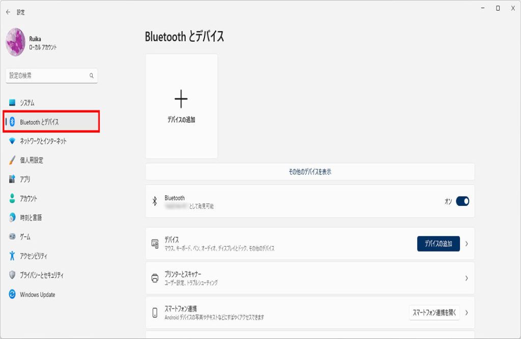 「設定」画面が表示されます「Bluetoothとデバイス」をクリックします。