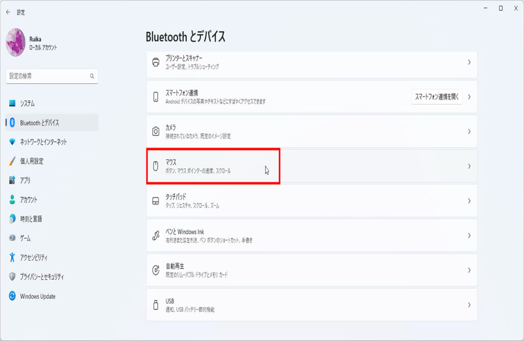「Bluetoothとデバイス」画面が表示されます、画面をスクロールして、マウスまで