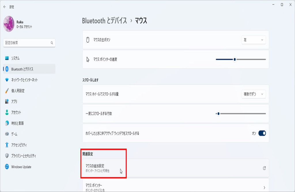 「マウス」画面が表示されます、関連設定の「マウスの追加設定」をクリックします。