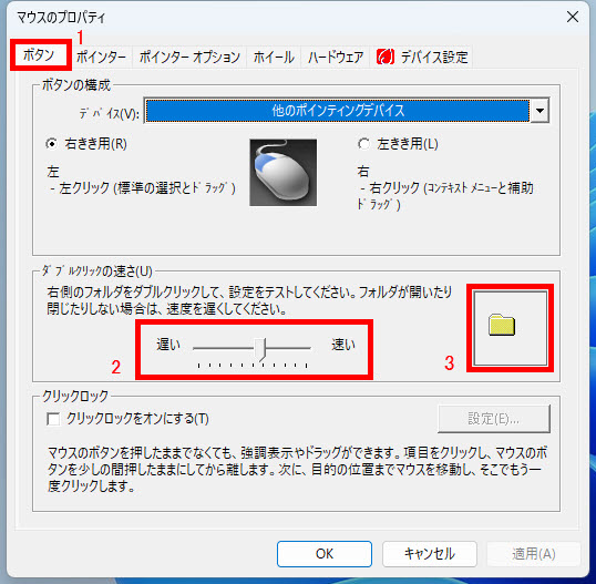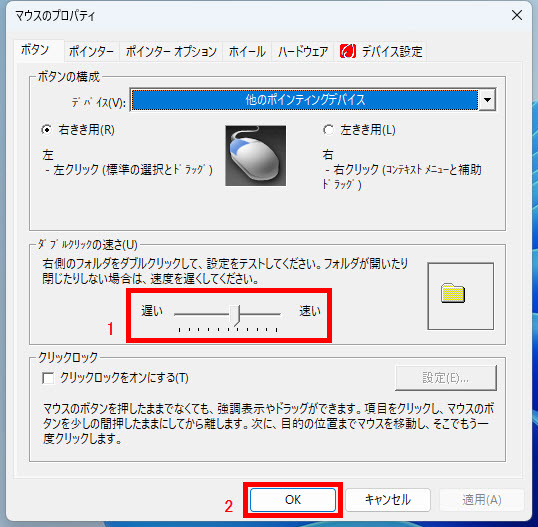 1 「ダブルクリックの速さ」を遅い、または速い」の方向にドラッグして調整します。