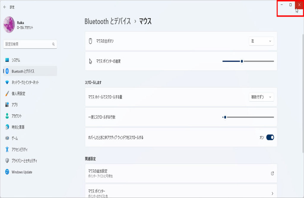 「マウス」画面に戻ります、右上の「×」をクリックして閉じます、設定は以上です。