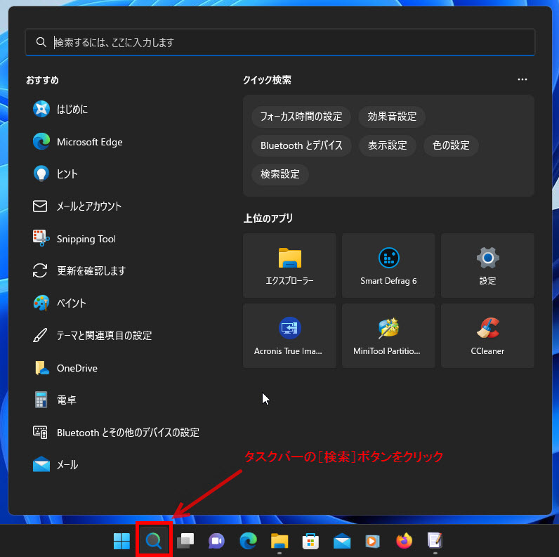 タスクバーの[検索]ボタンをクリックします。