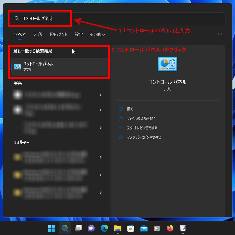 1 「コントロールパネル」と入力します。