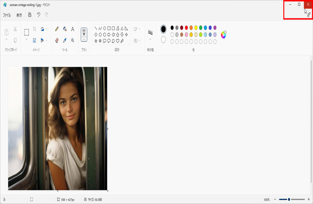 「ペイント」画面の右上の「×」をクリックして閉じます、操作は以上です。