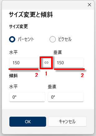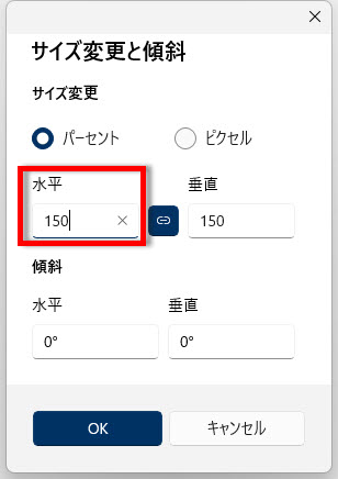 「水平」に「150」と入力、写真を150%に拡大します、拡大すると画質が粗くなります。