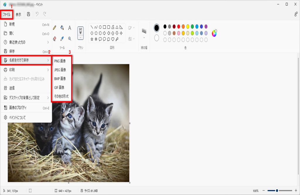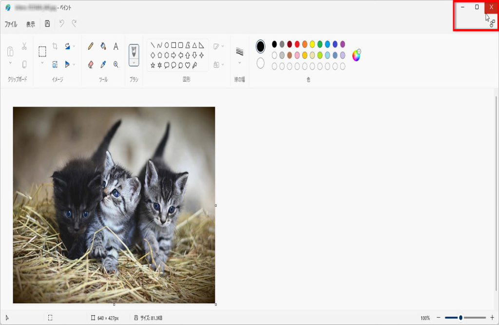 ペイントの右上の「×」をクリックして閉じます、操作は以上です、