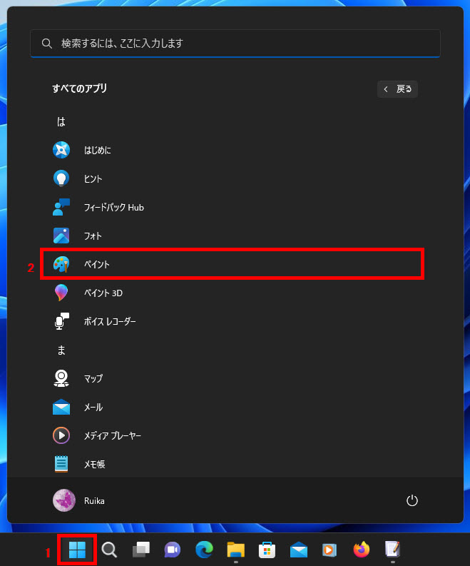 2 すべてのアプリの「ペイント」をクリックします。