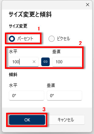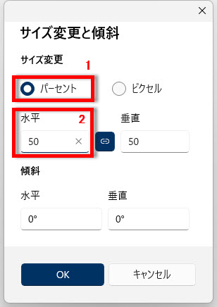 1 「サイズ変更」で「パーセント」を選択