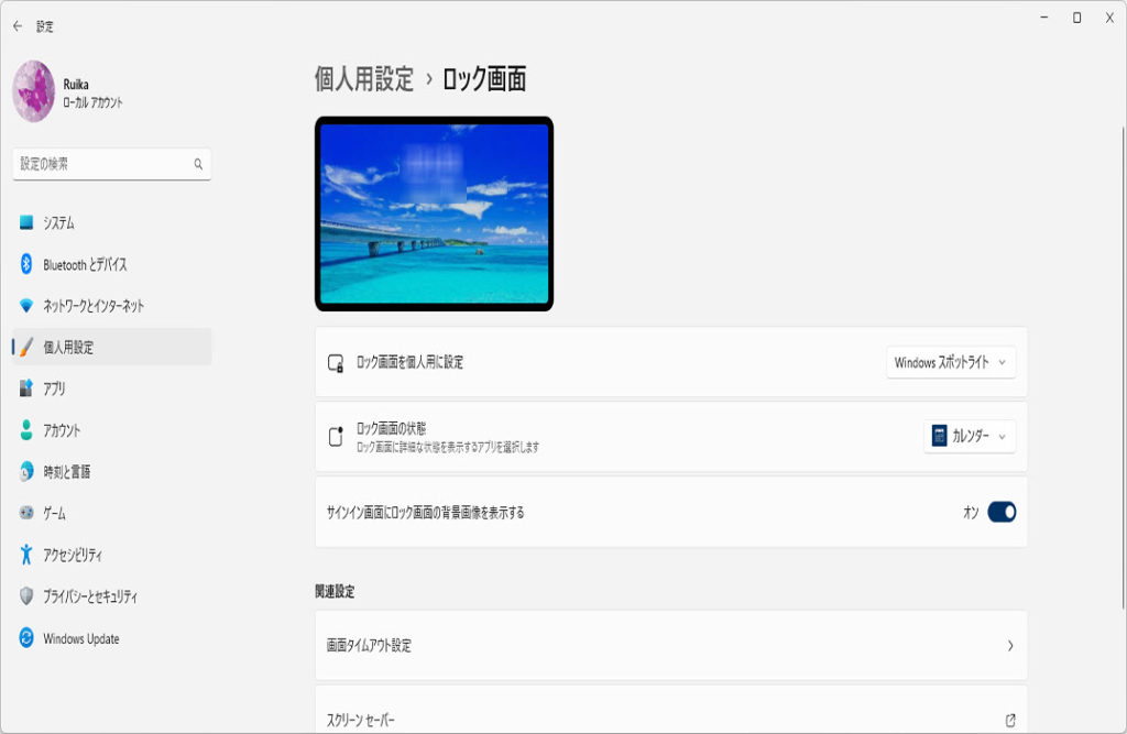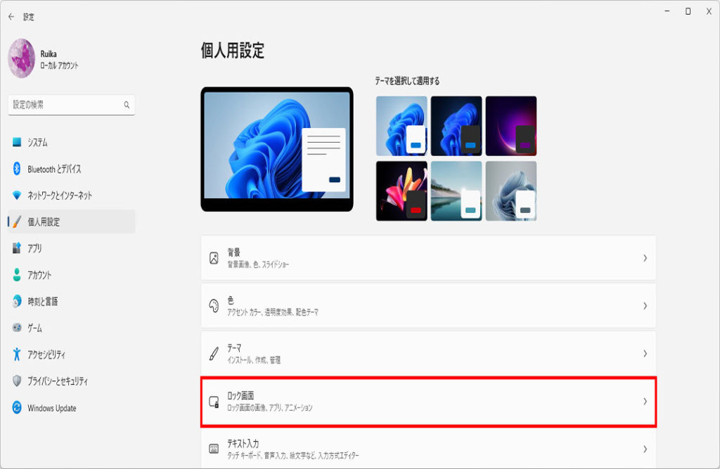 「個人用設定」から、右メニューの「ロック画面」をクリックします。