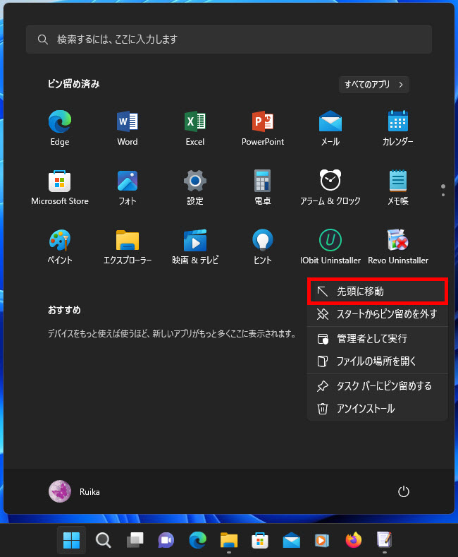 アプリをスタートメニューの先頭に移動