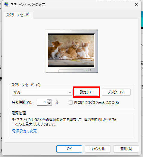 「スクリーンセーバー」欄の「設定」をクリックします。