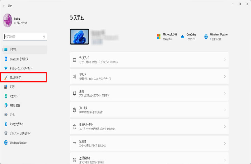 「設定」画面が表示されます「個人用設定」をクリックします。