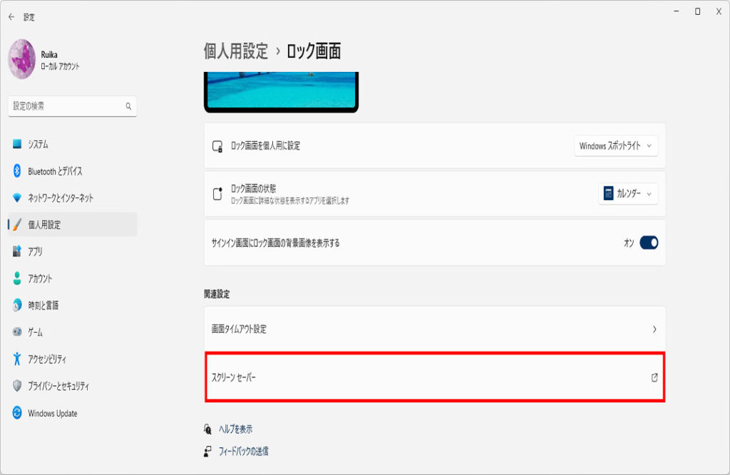 下にスクロールします、右メニューの「スクリーンセーバー」をクリックします。