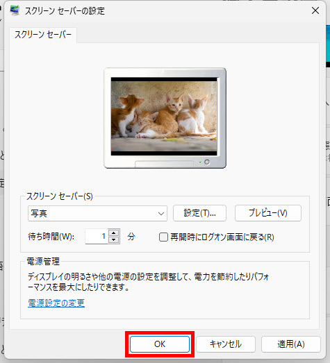「スクリーンセーバーの設定」に戻り「OK」ボタンをクリックします。