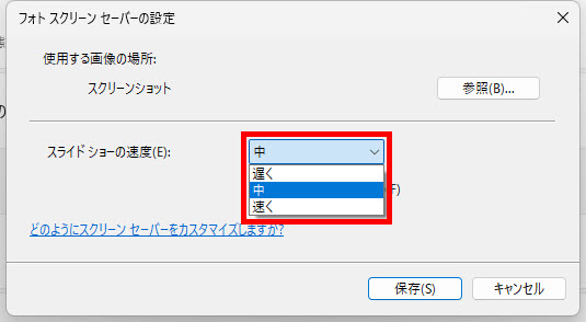 「フォトスクリーンセーバーの設定」にある「スライドショーの速度」ボックスで