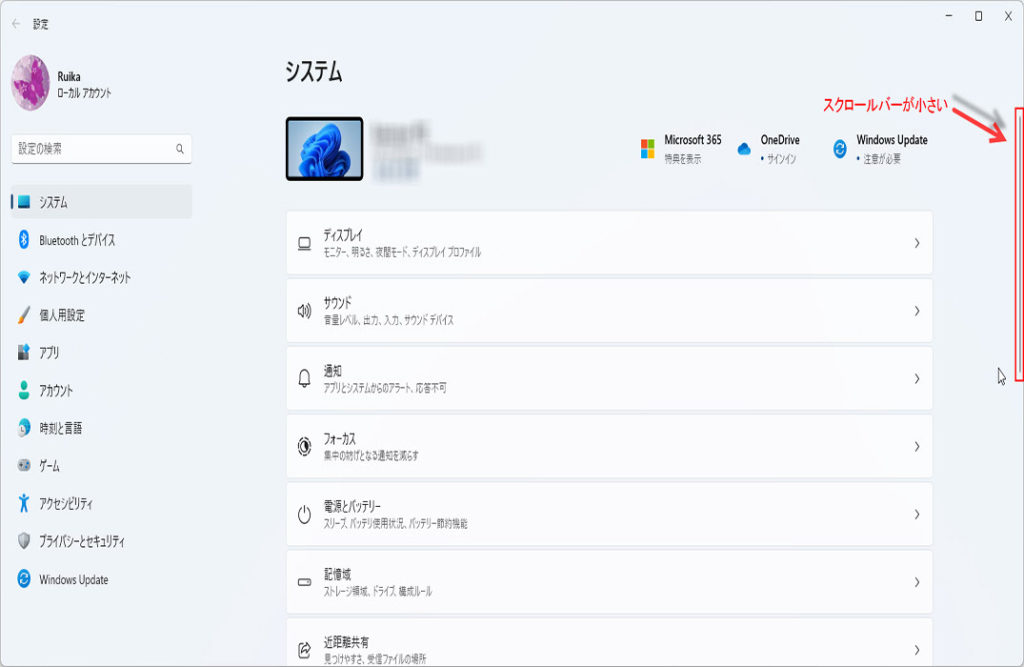 Windows11は、スクロールが必要な場合でもスクロールバーは表示されません。