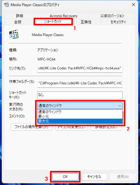 Media Player Classicのプロパティ画面