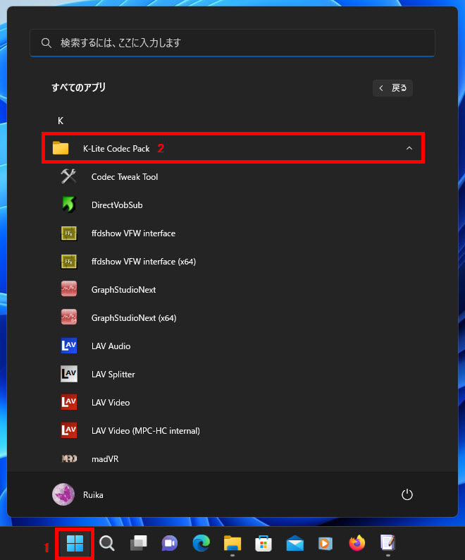 2 すべてのアプリの「K-Lite Codec Pack」フォルダをクリック、下にスクロールします。