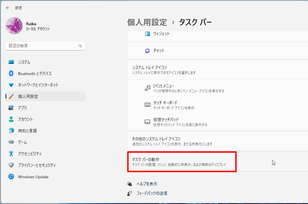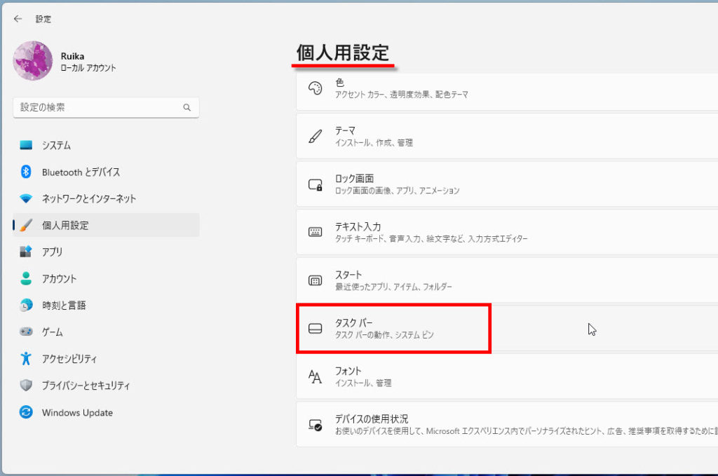 個人用設定の右メニューを下にスクロールして「タスクバー」をクリック、上記と同じ操作で
