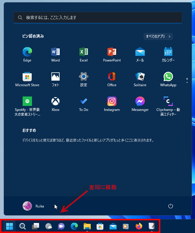 タスクバーボタンとスタートメニューを使いやすい位置にしておきましょう。
