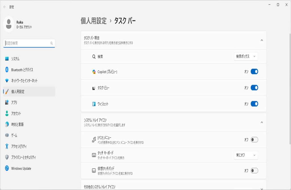 下にスクロールして「タスクバーの動作」をクリックします。