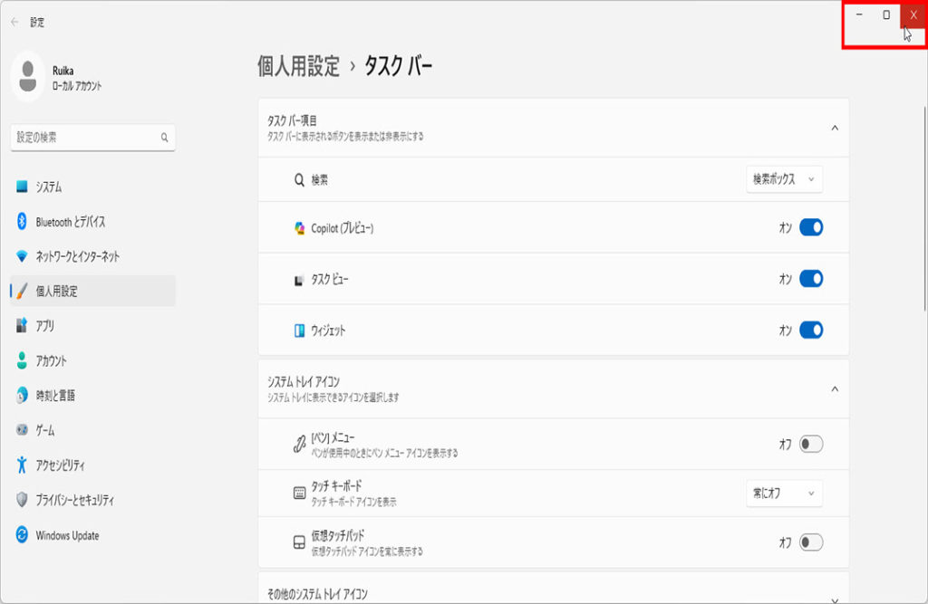 「タスクバー」画面の右上の「×」をクリックして閉じます、操作は以上です、