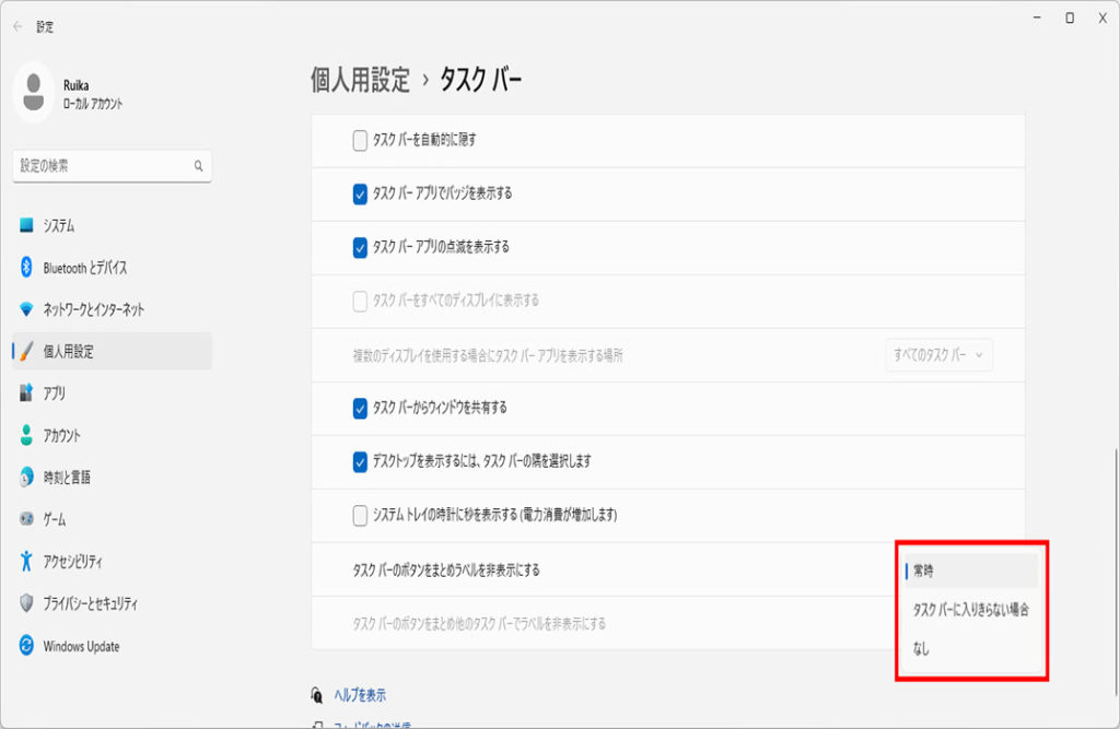 下にスクロールして「タスクバーのボタンをまとめラベルを非表示にする」のボックスを