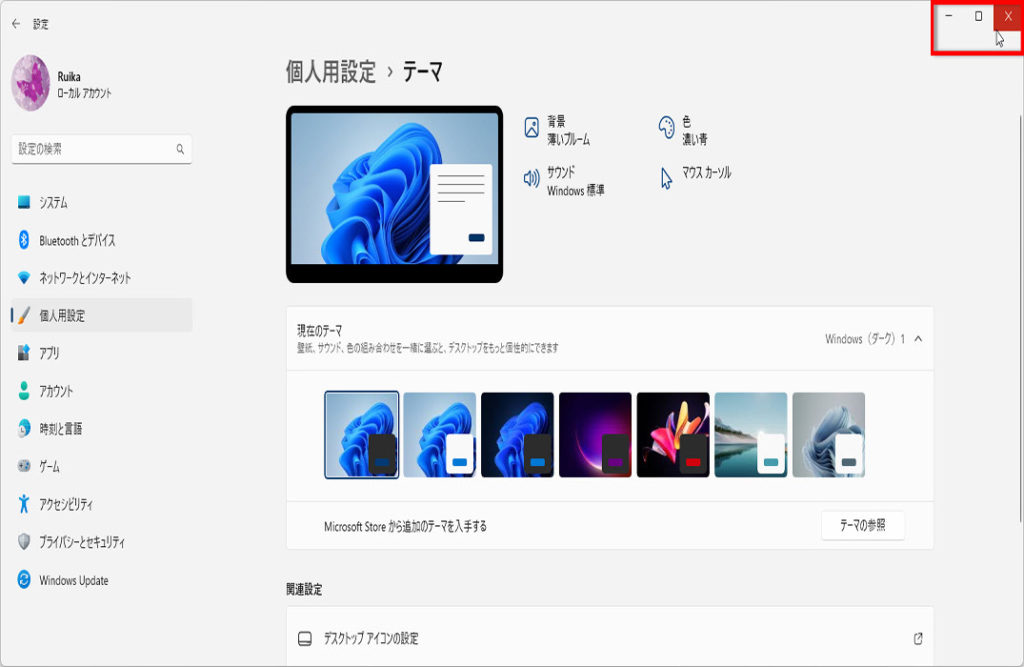 「テーマ」画面に戻ります、右上の「×」をクリックして閉じます、操作は以上です