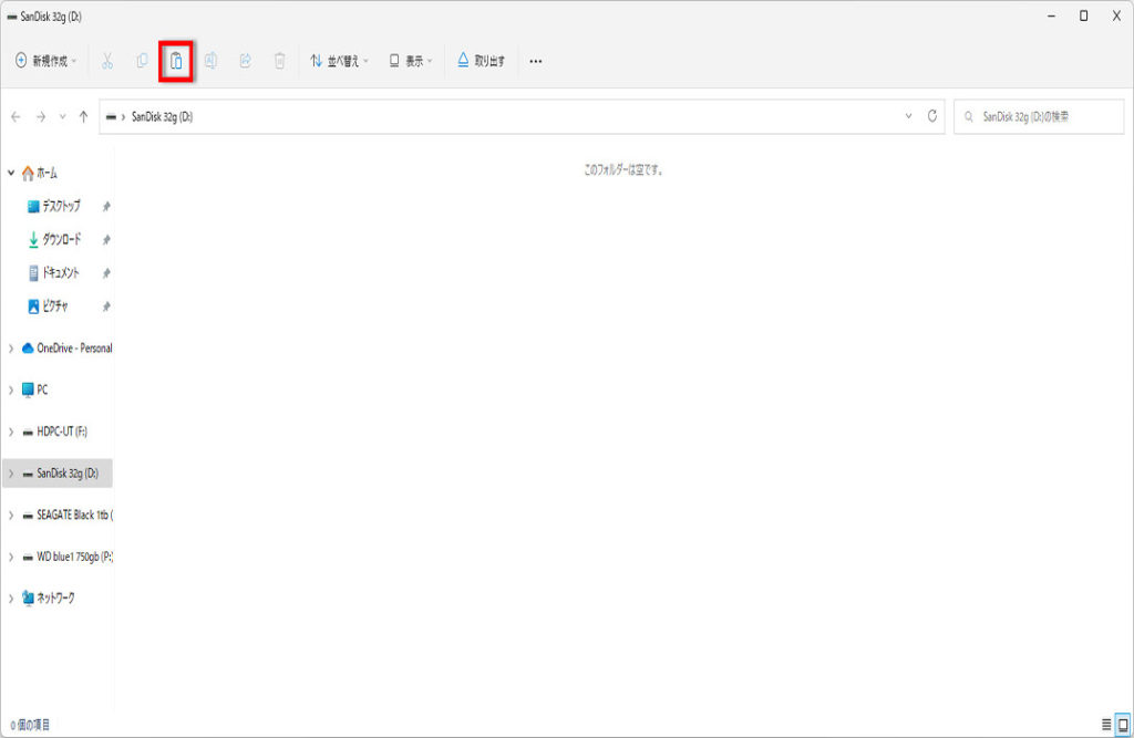 左メニューのUSBメモリーをクリックして、貼り付けボタンをクリックします。