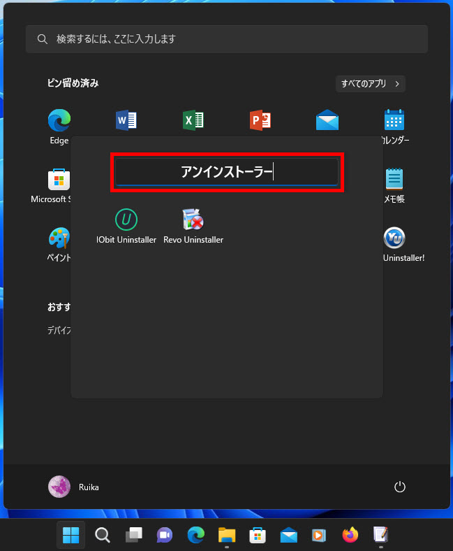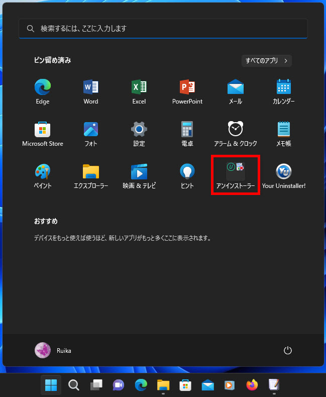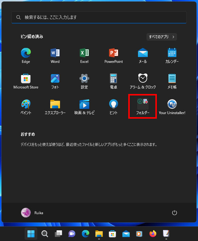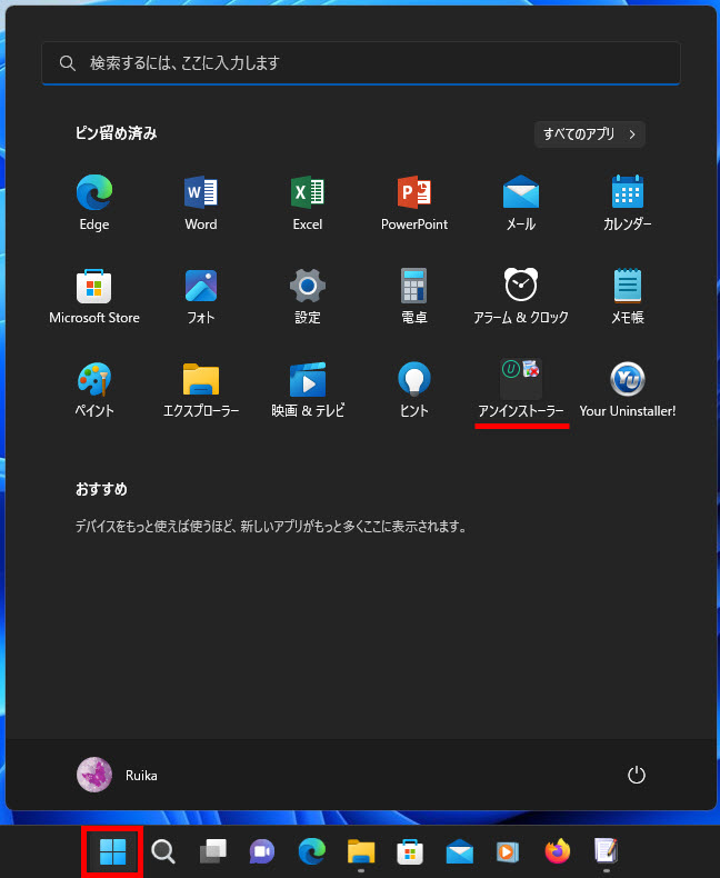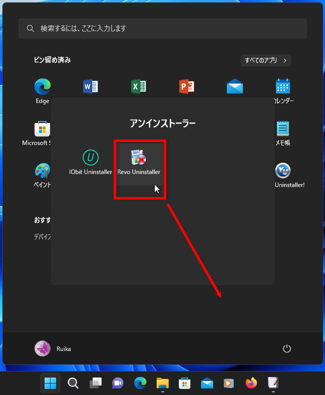 「スタート」メニューのアンインストーラーフォルダーをクリックします。