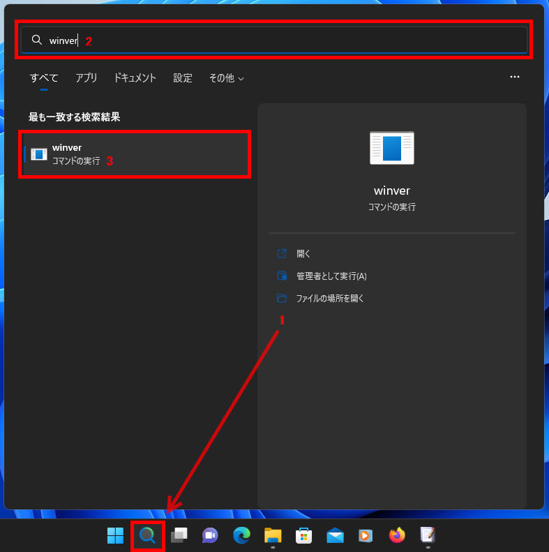 1 タスクバーの検索アイコンをクリック、2 検索ボックスに「winver」と入力