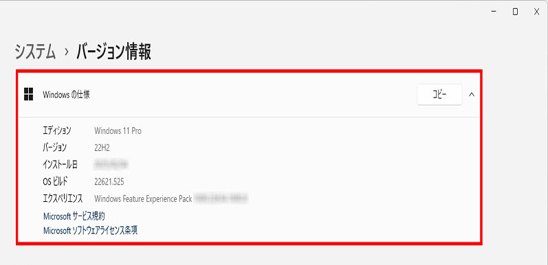 右メニューの「バージョン情報」画面を下にスクロールして「Windowsの仕様」欄の