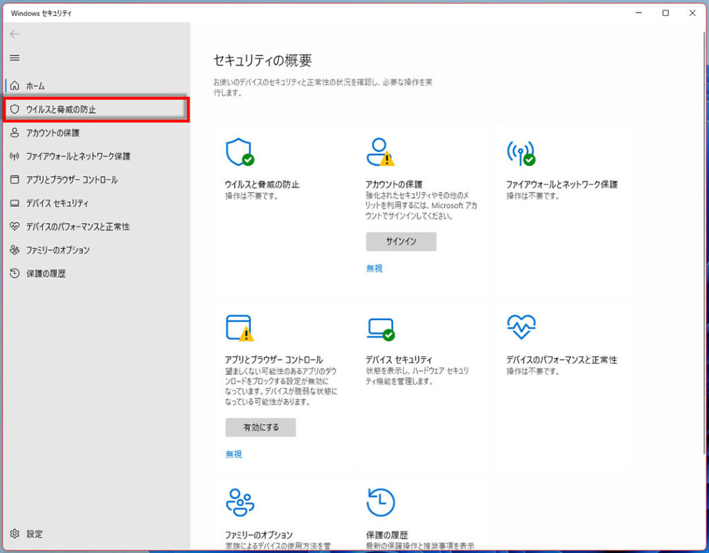 「セキュリティの概要」画面が表示されます「ウイルスと脅威の防止」を、