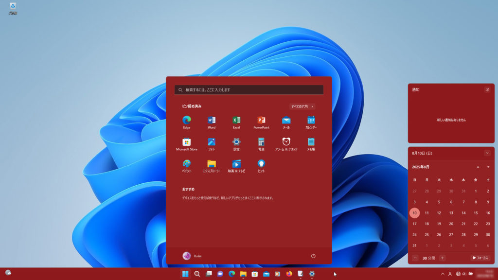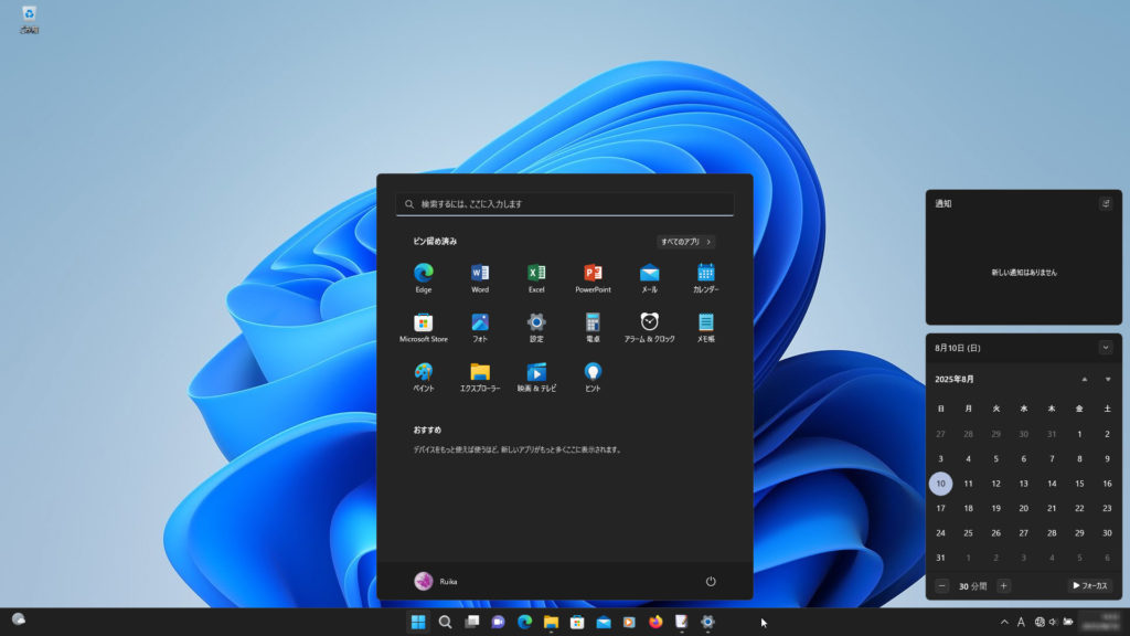 Windows11のデスクトップのスタートメニュー、タスクバー、通知領域と