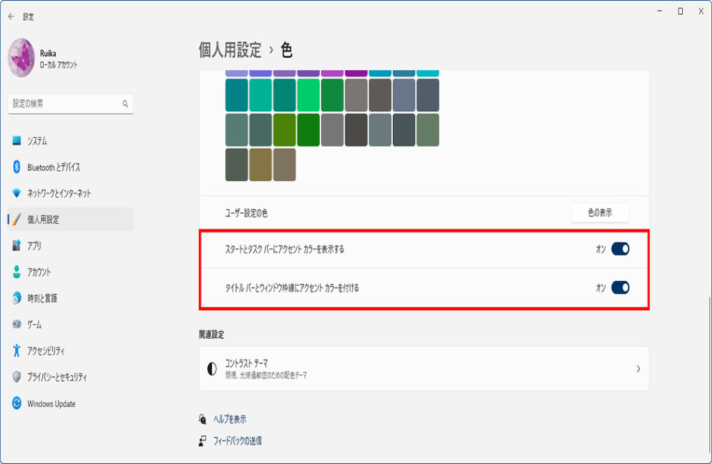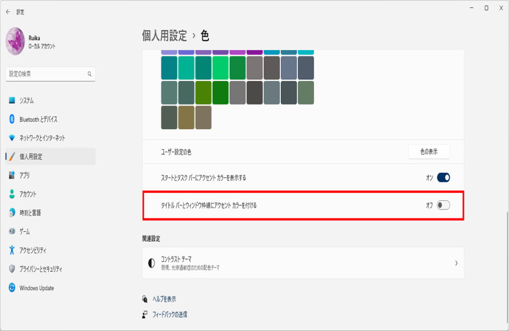 「タイトルバーとウィンドウ枠線にアクセントカラーを付ける」を「オン」にします。