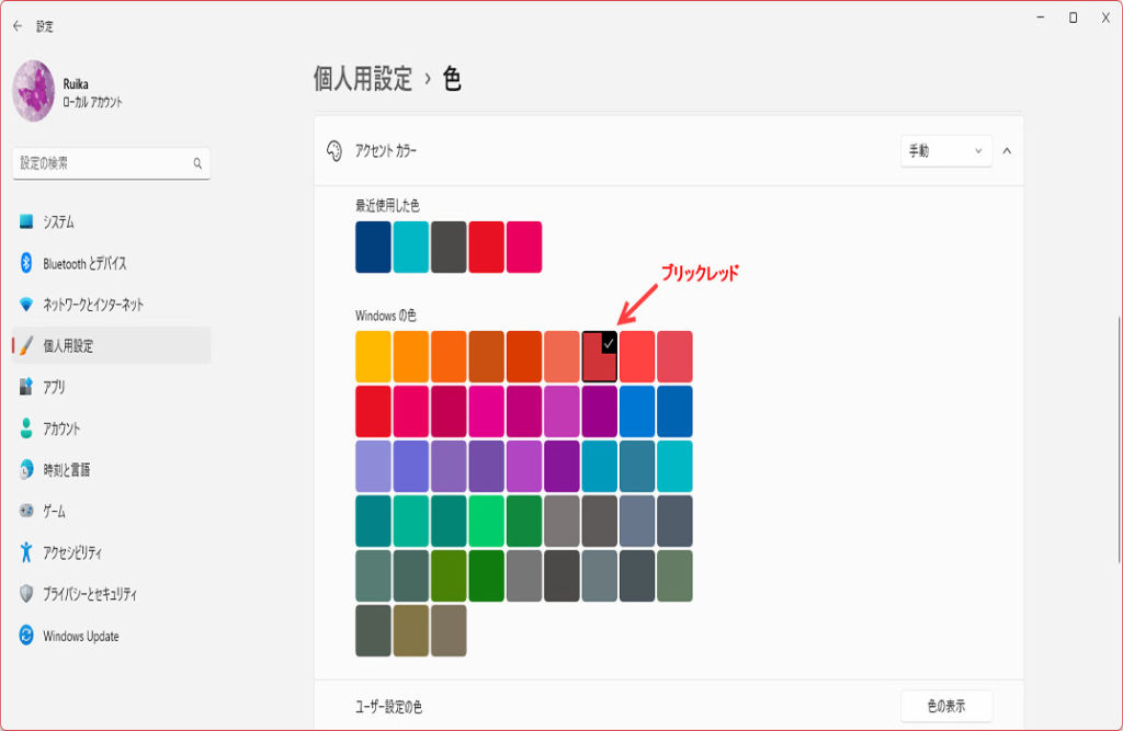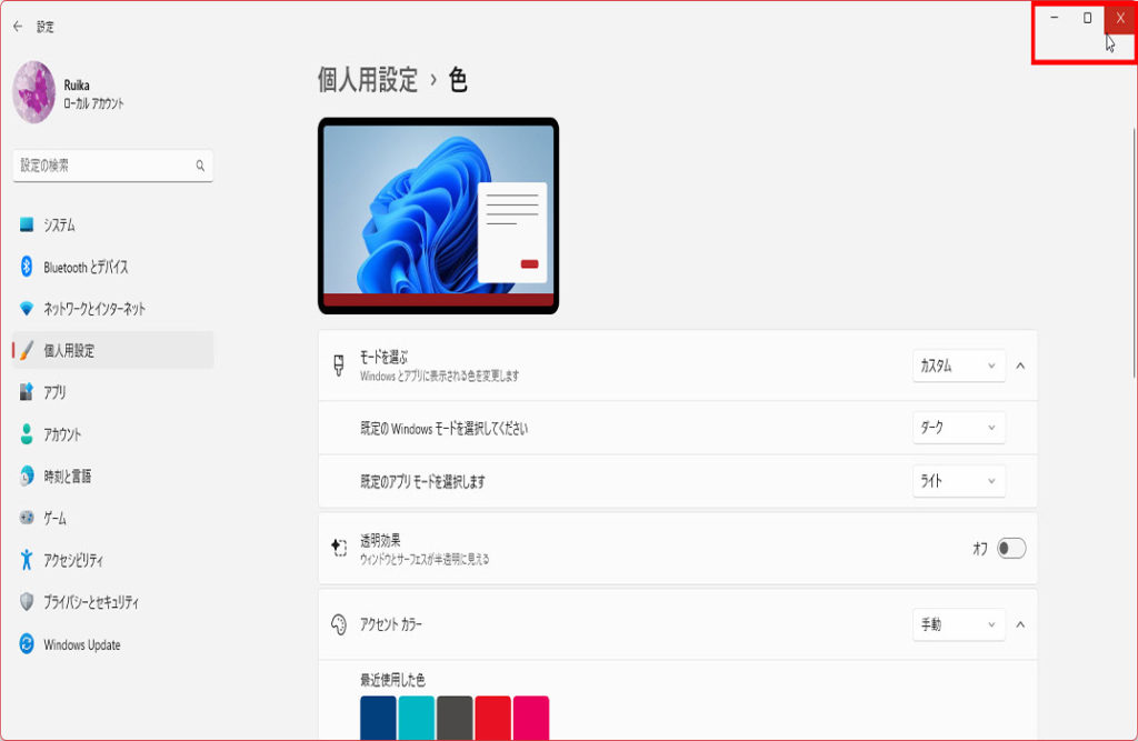 「個人用設定の色」画面の右上の「×」をクリックして閉じます、操作は以上です、
