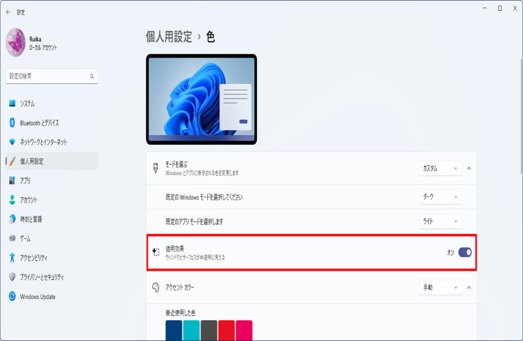 スタートメニュー、タスクバー、通知領域などの色を半透明にする時は