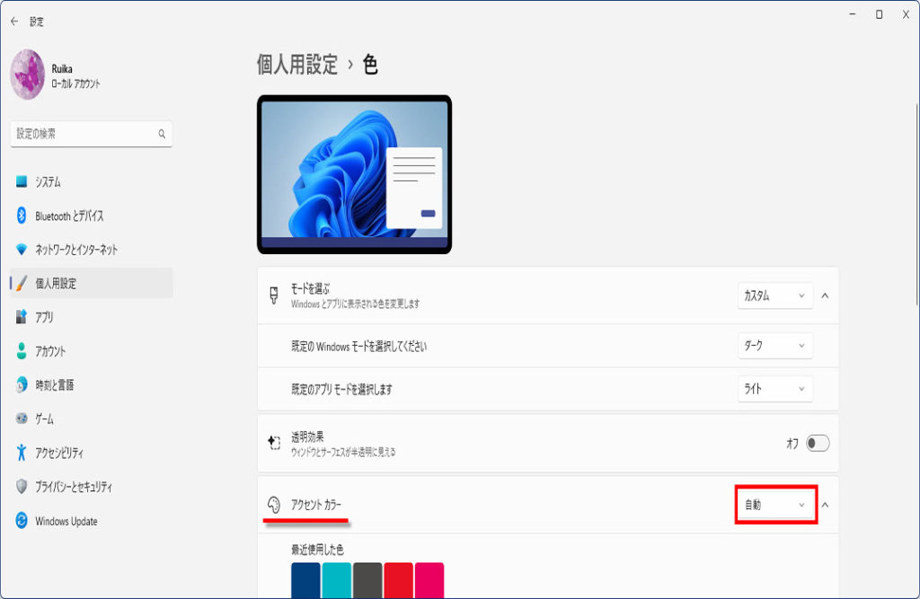 「アクセントカラー」のボックスの設定が「自動」の場合、自動でウィンドウの色が